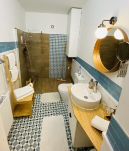 Minden minden 2 fős szobához tartozik egy fürdőszoba: – zuhanyzós, törölközők+felszerelt pipere cikkekkel kínáljuk ( folyékony szappan, testápoló, fürdősampon, törlőkendő, arclemosó )